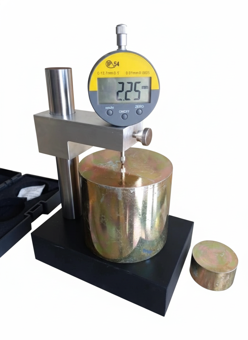 – Thiết bị đo độ dày gồm một đế phẳng bằng kim loại không rỉ và một đĩa ép phẳng, hình tròn trên gắn đồng hồ đo
