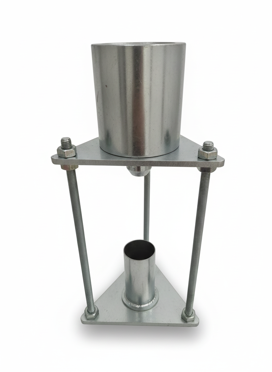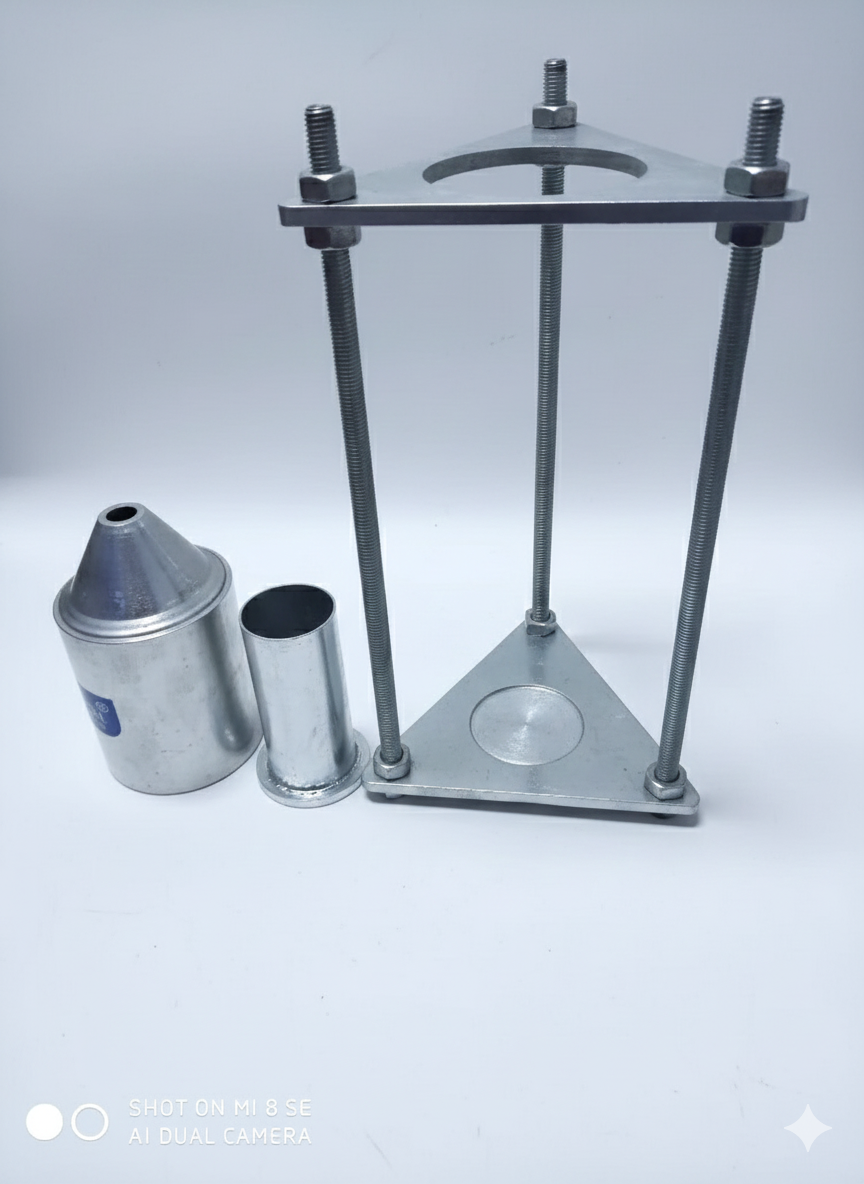 – Giá đỡ: bằng kim loại, có 3 chân hoặc 4 chân, có khả năng giữ phễu chứa cốt liệu ổn định trên giá. Trục của phễu trùng với trục của ống đong với sai số về góc (của 2 đường trục) phải nhỏ hơn 40 và sai số về khoảng cách nhỏ hơn 2 mm.